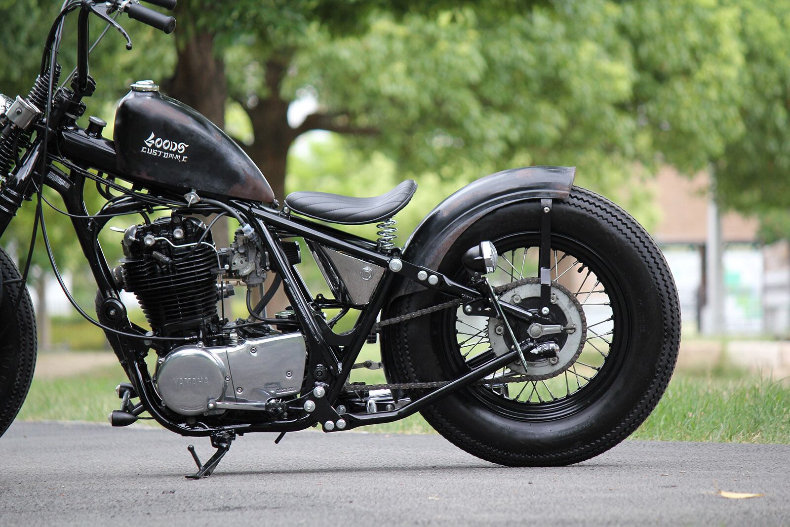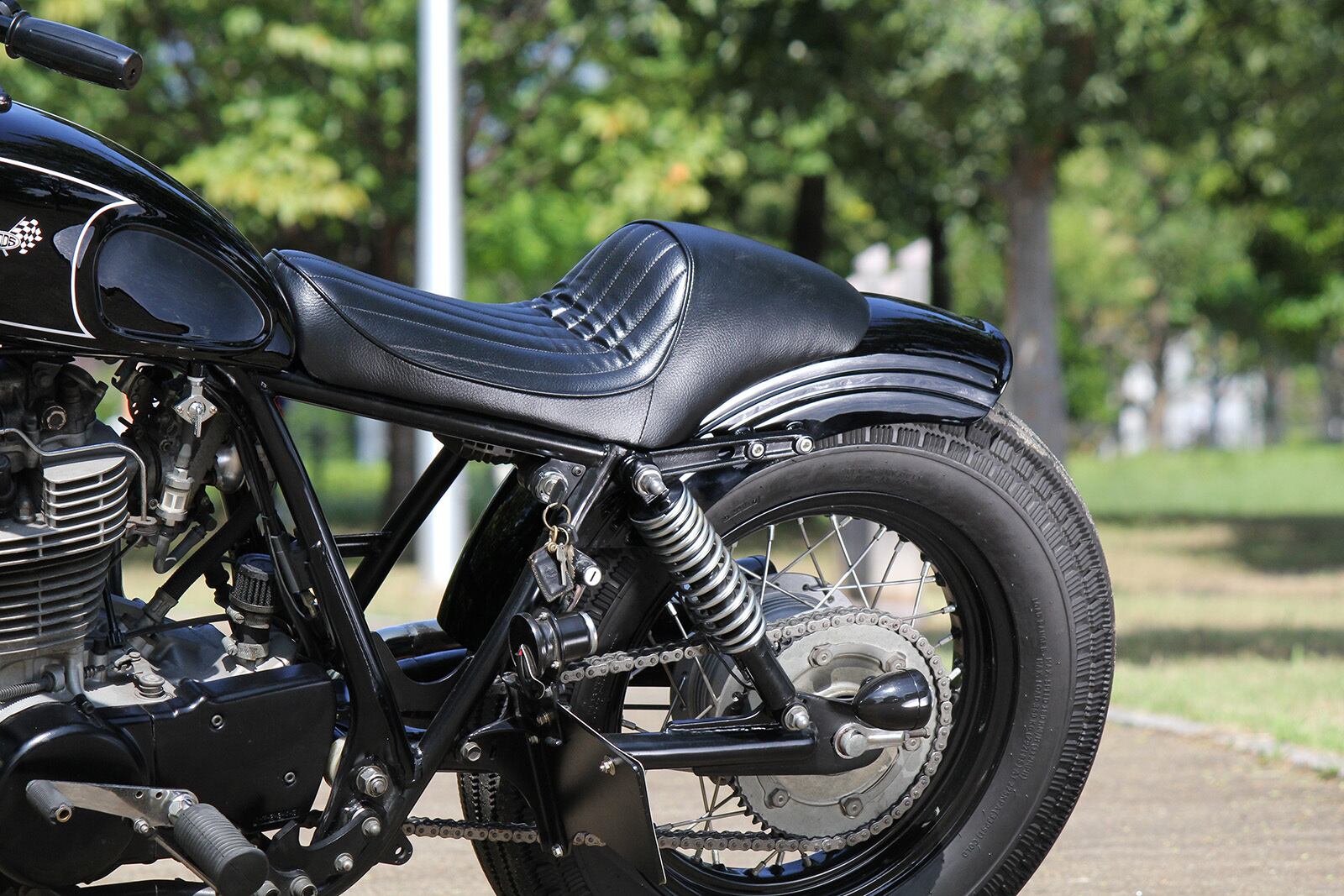 Universal steel fender. A slight bob end is an accent. The chain escape is on the left side. Processing is required for installation. *The included collar and bolts are not required for installation, but please feel free to use them.