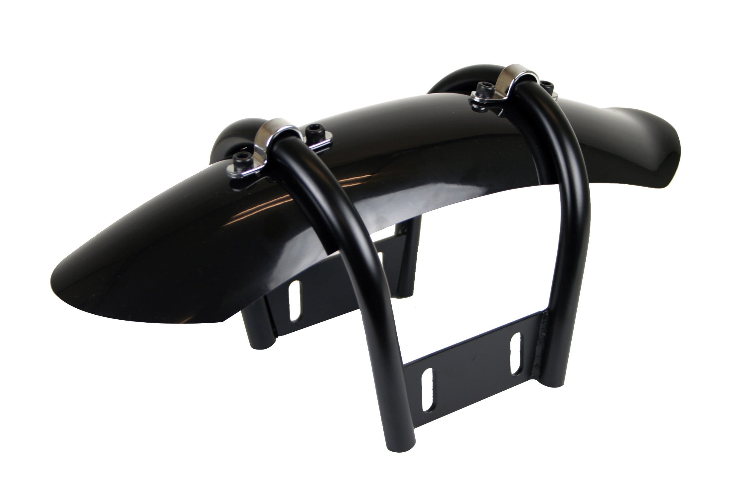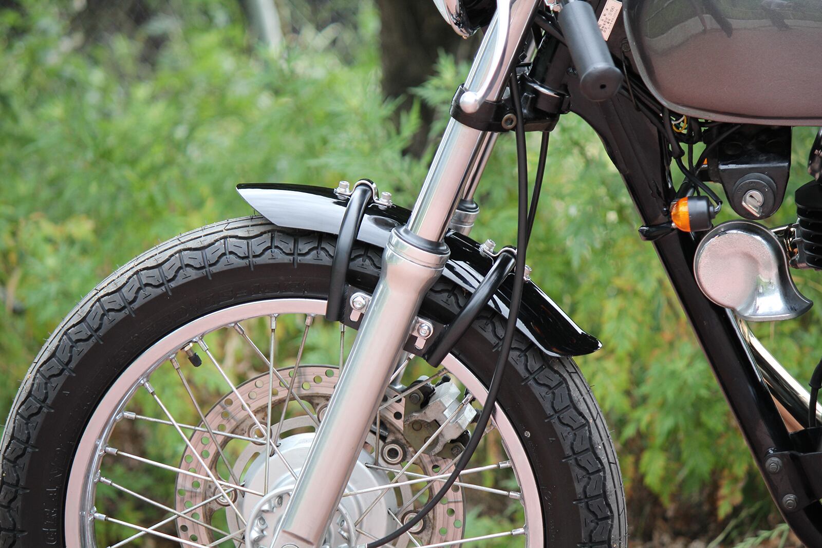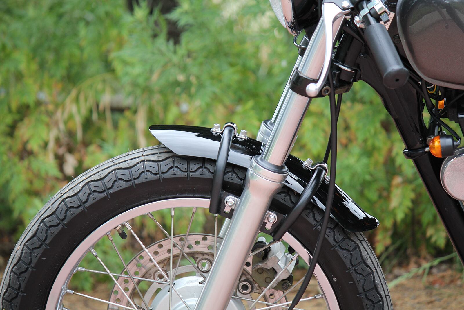 Bolt-on front fender for Estrella. The mounting position can be moved up or down, making it possible to install tires with high height such as Firestone. The stay that doubles as a stabilizer also has the effect of increasing front rigidity. It is necessary to remove the front wheel during installation.
