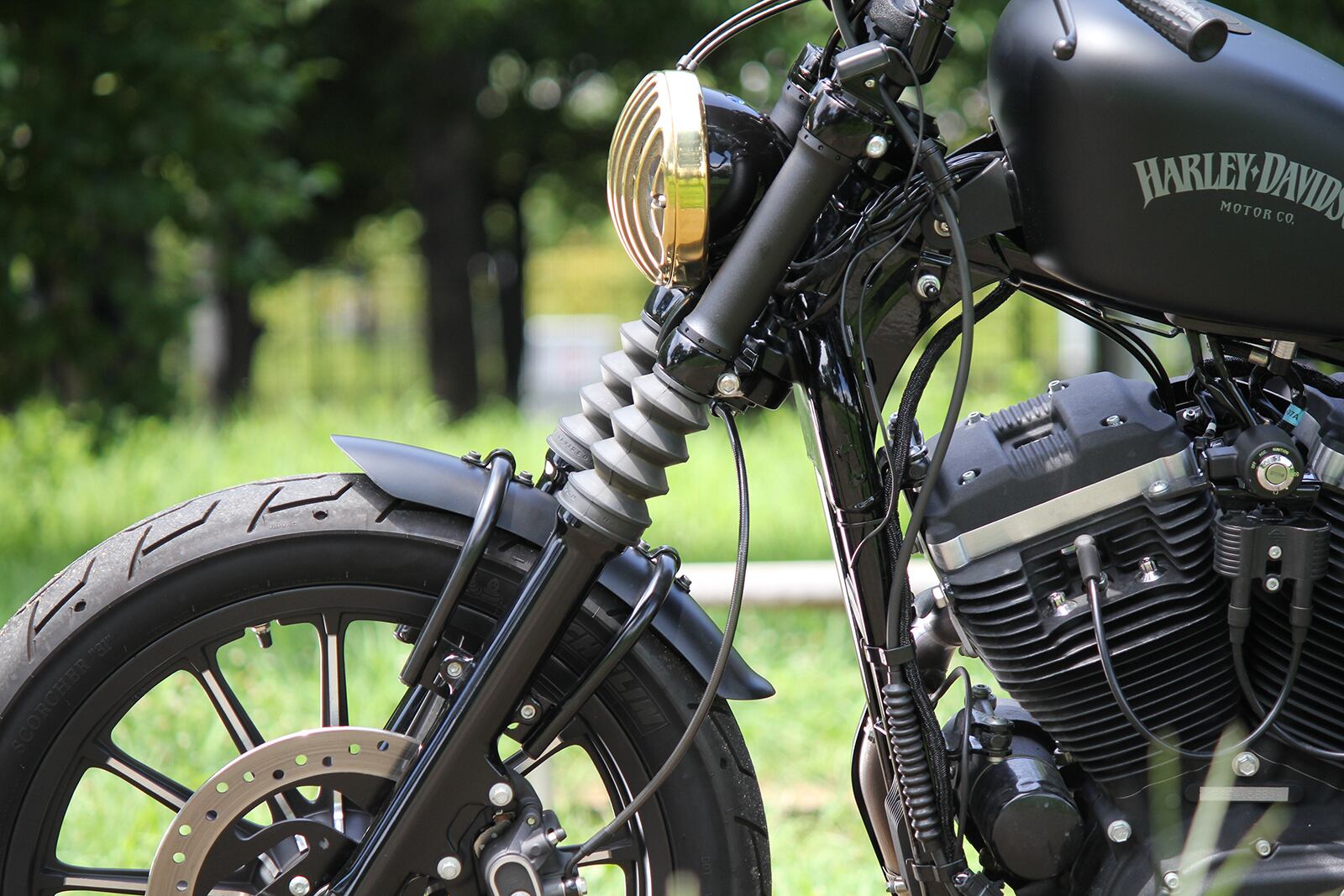Bolt-on front fender to Harley φ39mm fork. Black painted finish. The mounting position can be moved up or down, making it possible to install tires with high height such as Firestone. The stay that doubles as a stabilizer also has the effect of increasing front rigidity. *For installation, use genuine bolts and require removing the front wheel.