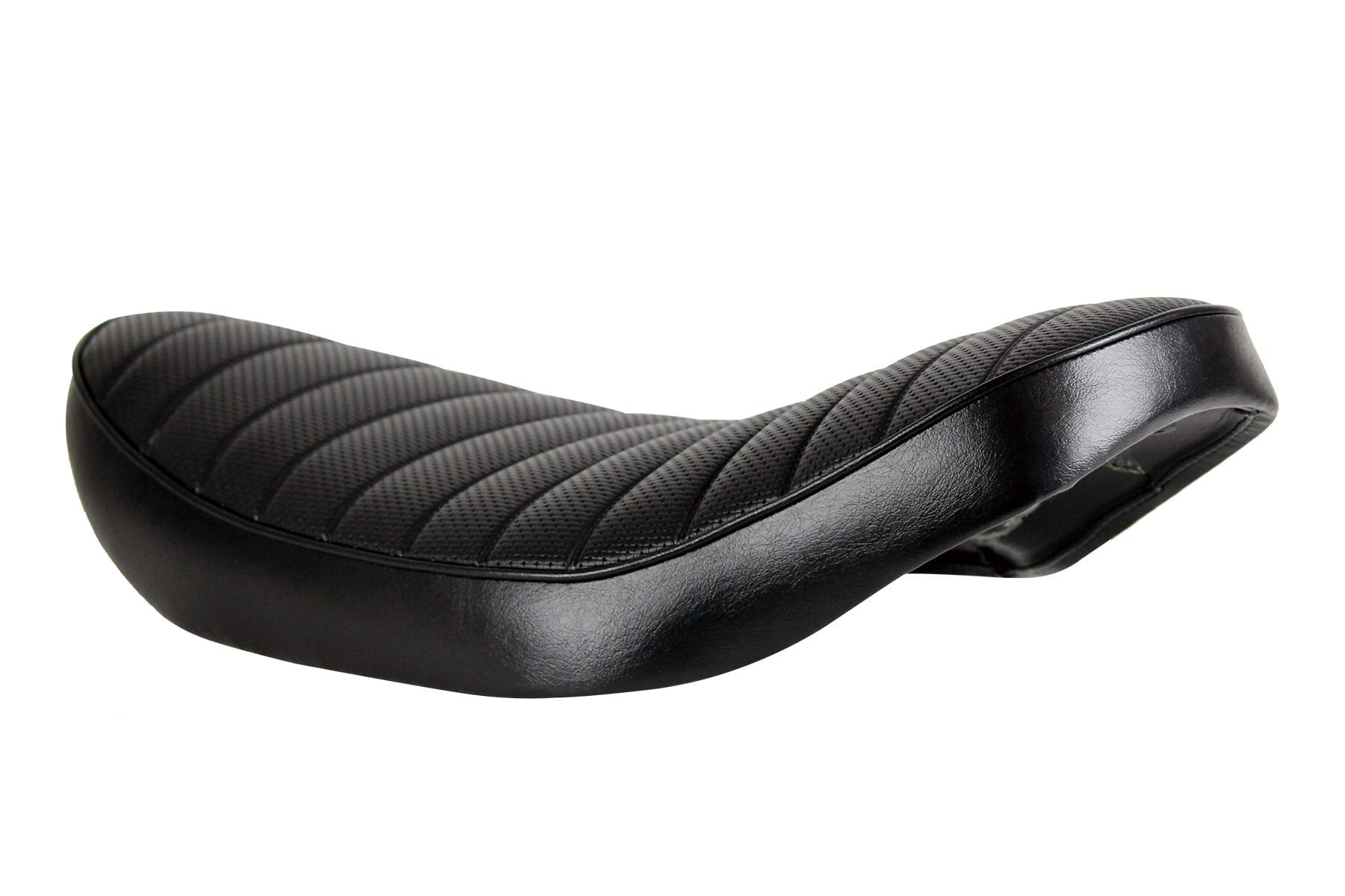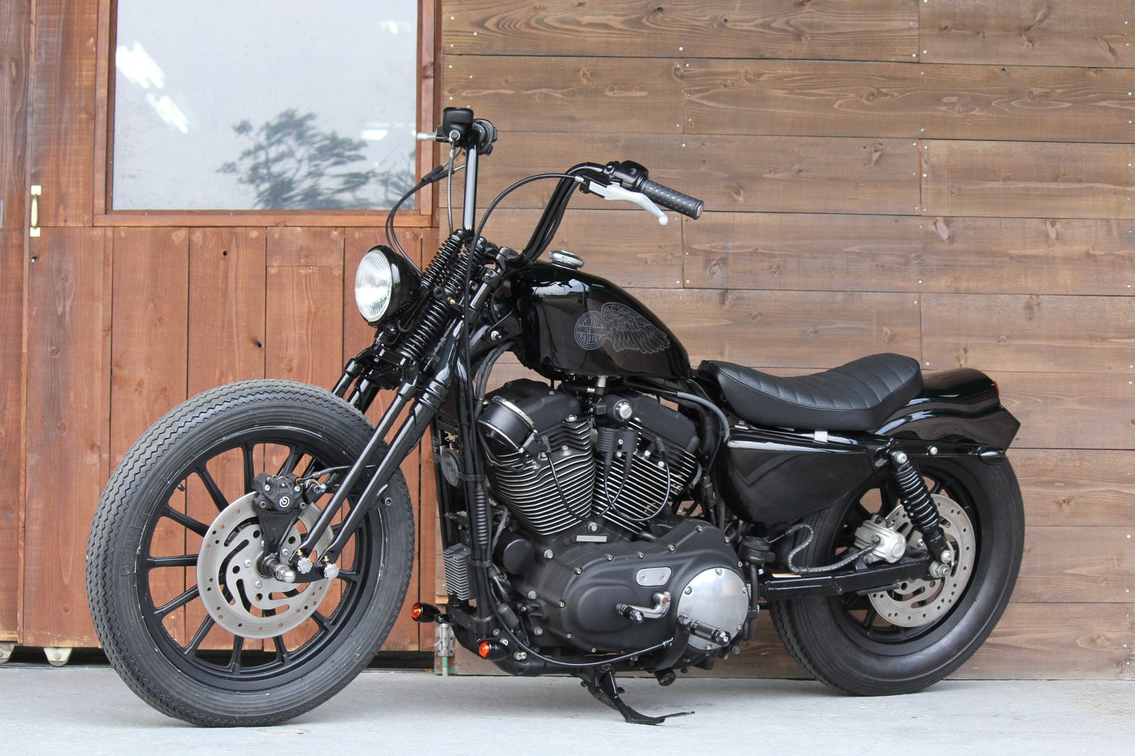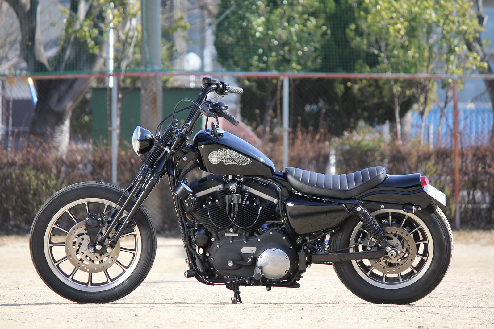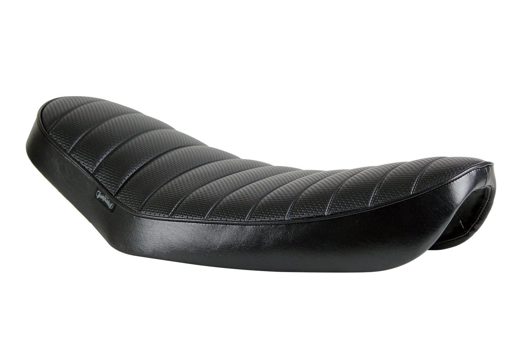 Solo seat for Sportster (10'~). The back-up shape absorbs acceleration, and the seat surface is embossed and horizontally tacked with high-frequency welding to enhance the grip. The flowing line from the tank to the fender and the base along the frame improve footing.