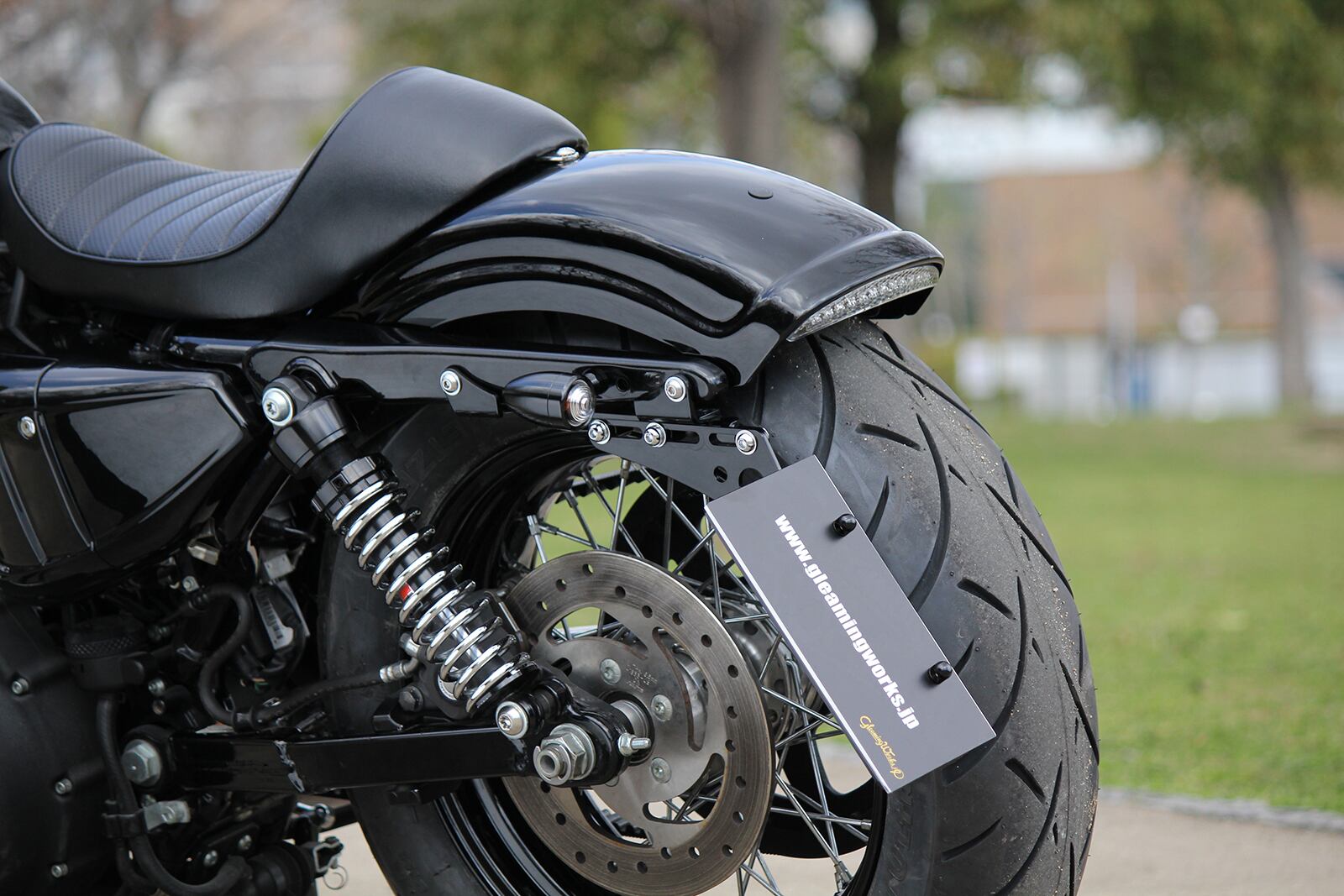Maintains the original 11-inch low-down style of the XL1200X, etc., and improves ride comfort. With a reasonable spring rate (hardness) setting and sufficient stroke, it doesn't bottom out quickly and doesn't feel like it's pushing up. It is slightly thicker overall than the stock, with a moderate volume to match the size of the vehicle, and the mounting part and preload adjustment are made of billet aluminum, making it light and stylish.