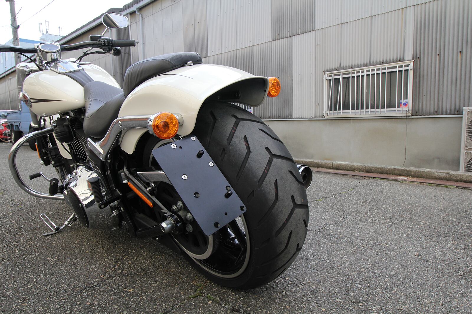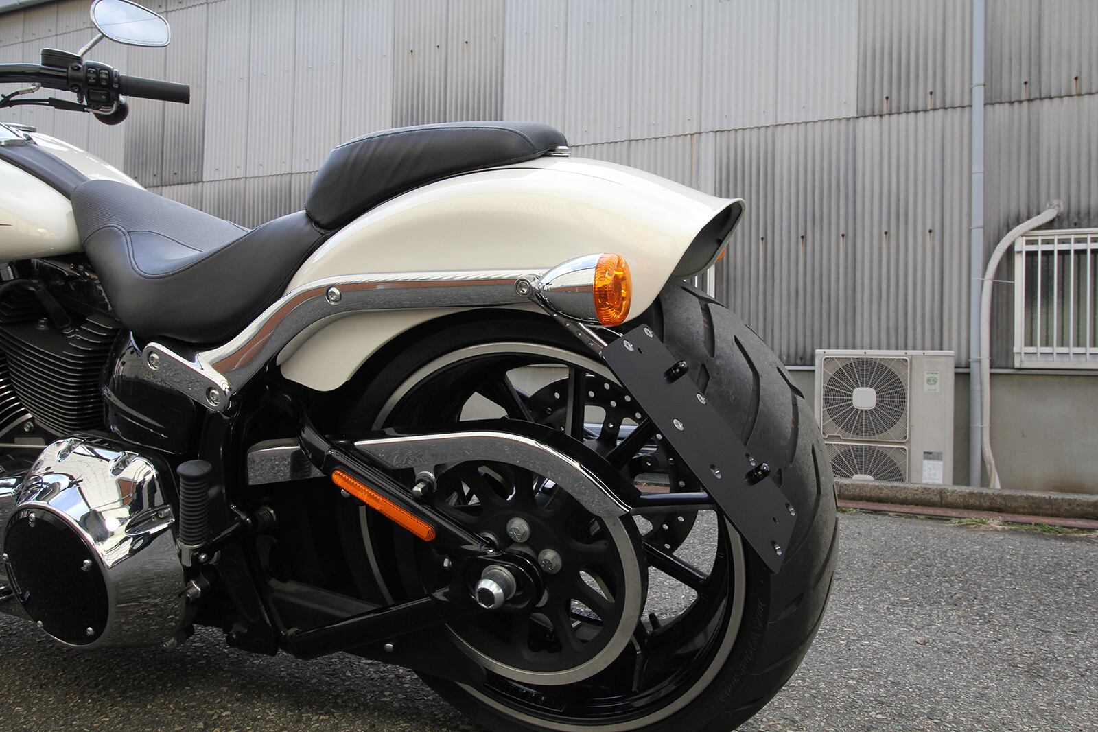 Side license plate kit for Breakout FXSB. Chrome stays from the inside of the strut and from the outside firmly fix the Side license plate. The mounting position is a stylish position that does not get in the way of the side bag and reduces overhang. License plates can be installed vertically and horizontally and come with LED lighting license plate bolts. Separately sold collars and bolt-detachable systems are also available.