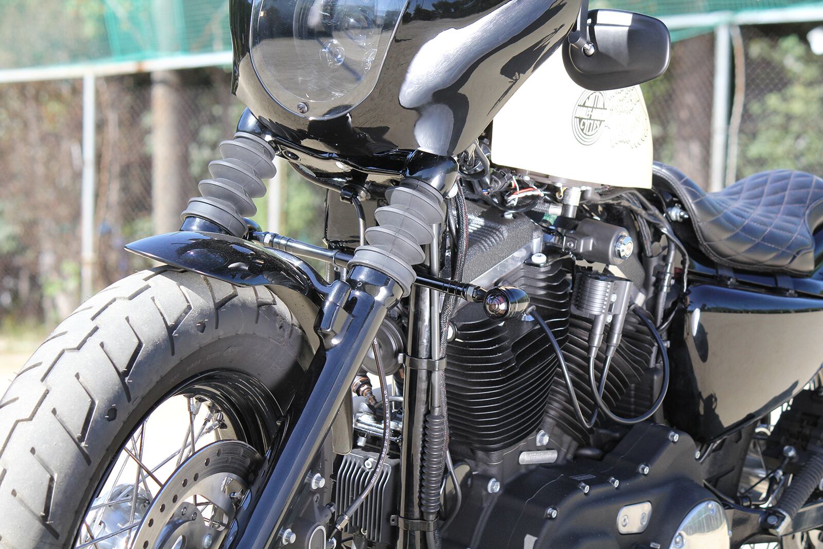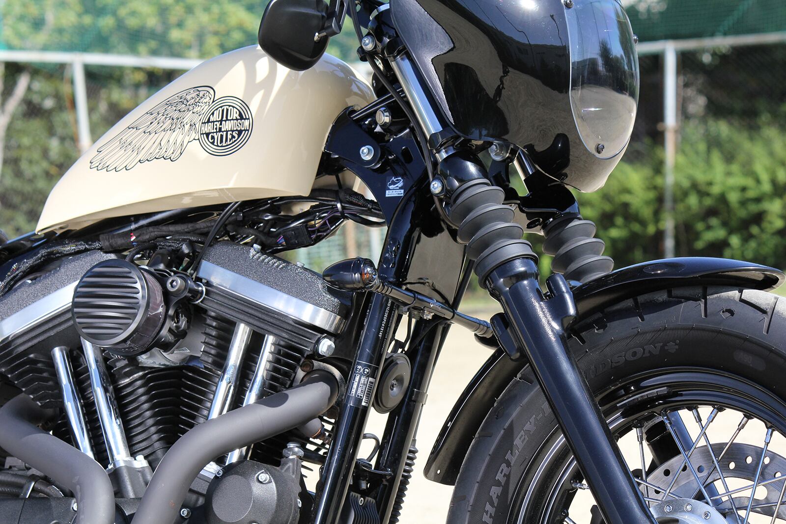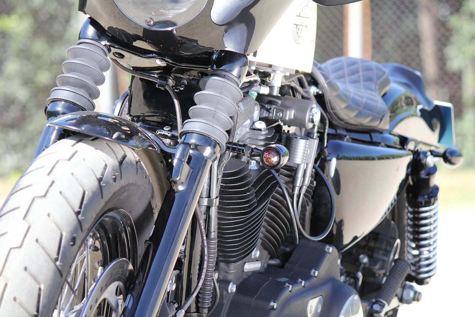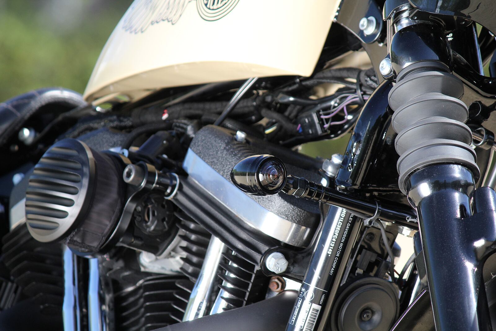 A bar-style turn signal stay that mounts on the front frame of the engine. Made of aluminum billet, it is lightweight and highly rigid, and the wiring runs through the bar neatly, making it an excellent compatibility with the GW 'Billet Winker' series.