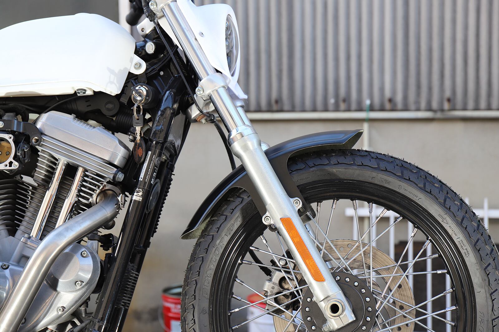 FRP short fender with a thin edged rib design. XL, for Dyna 39mm narrow glide fork. Recommended as a set with the rear short rib fender. Can be installed up to a tire width of 111mm (actual measurement).