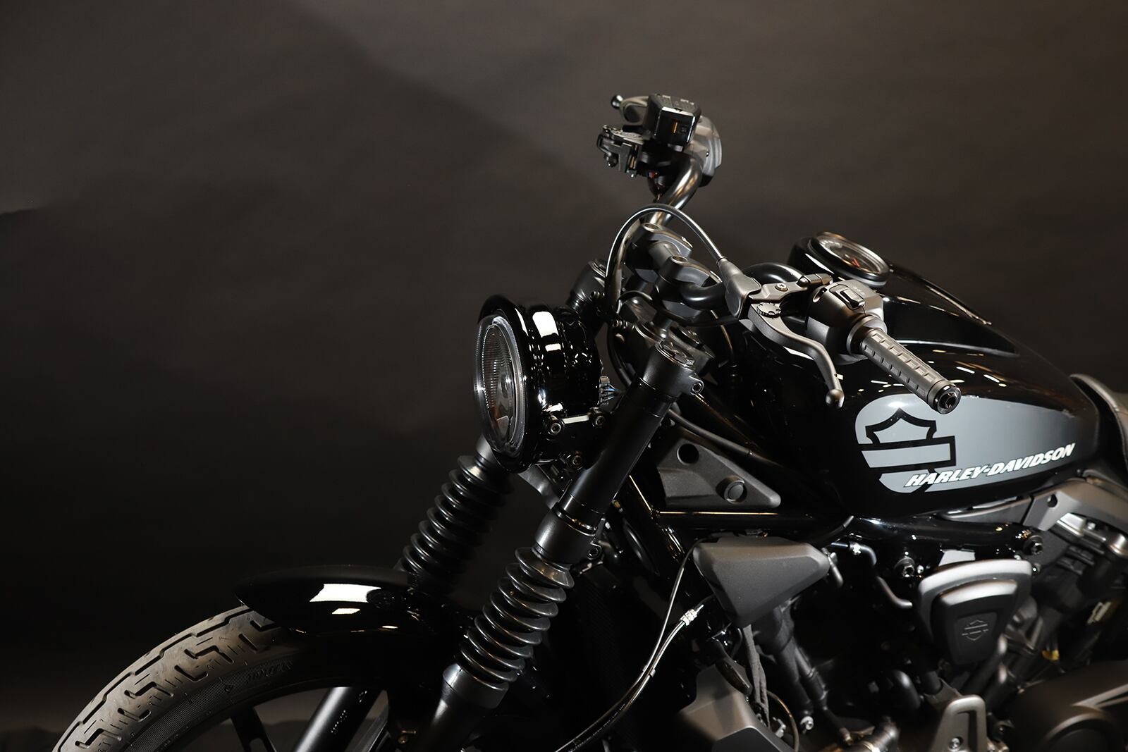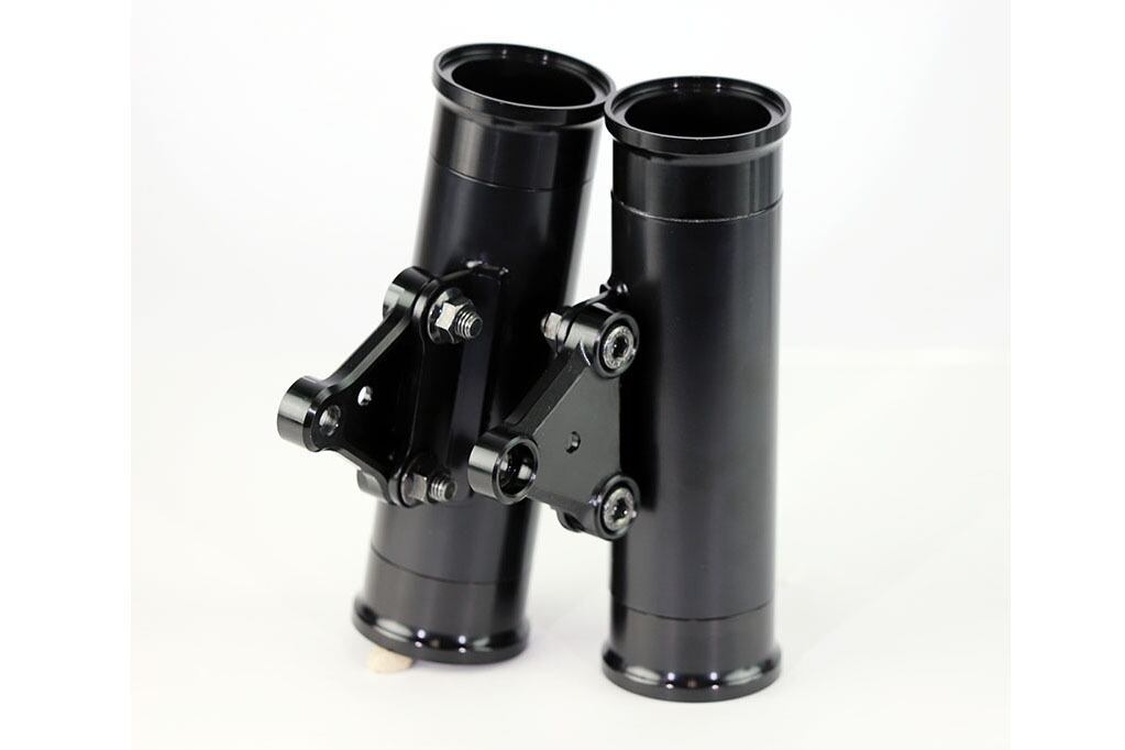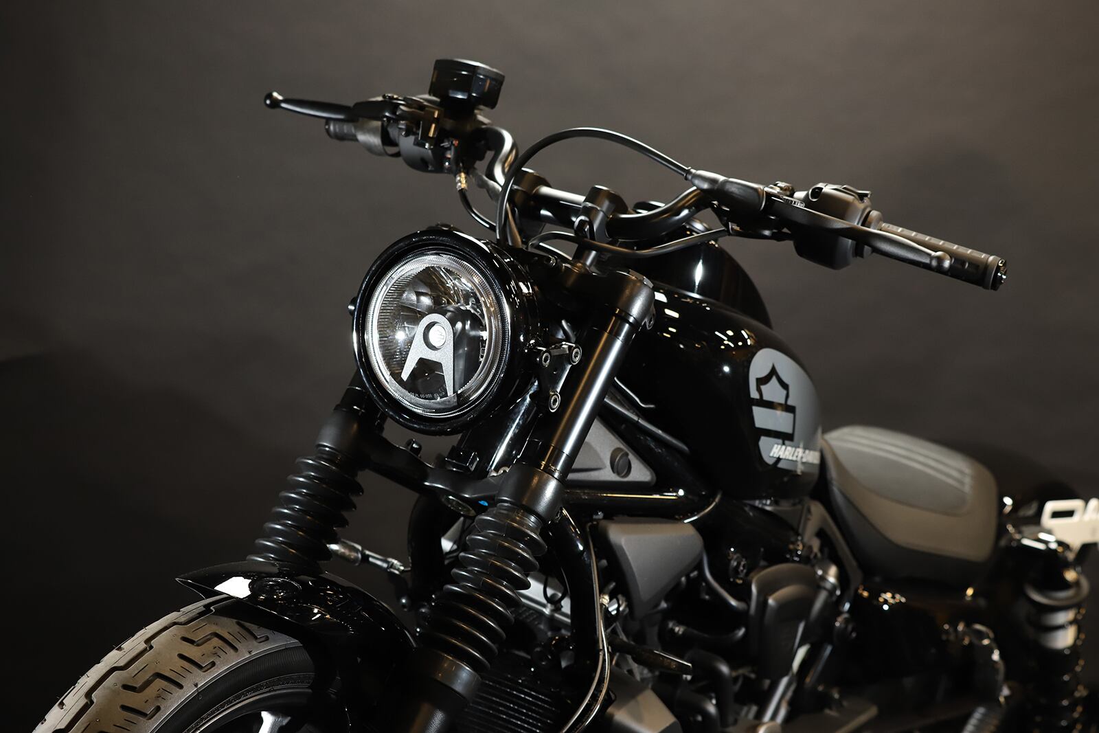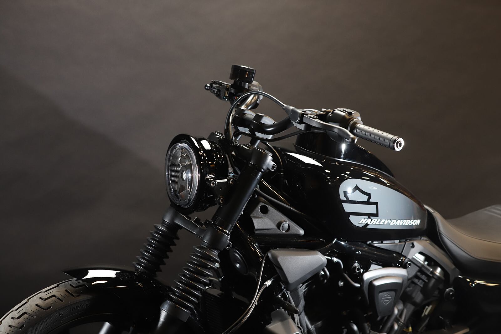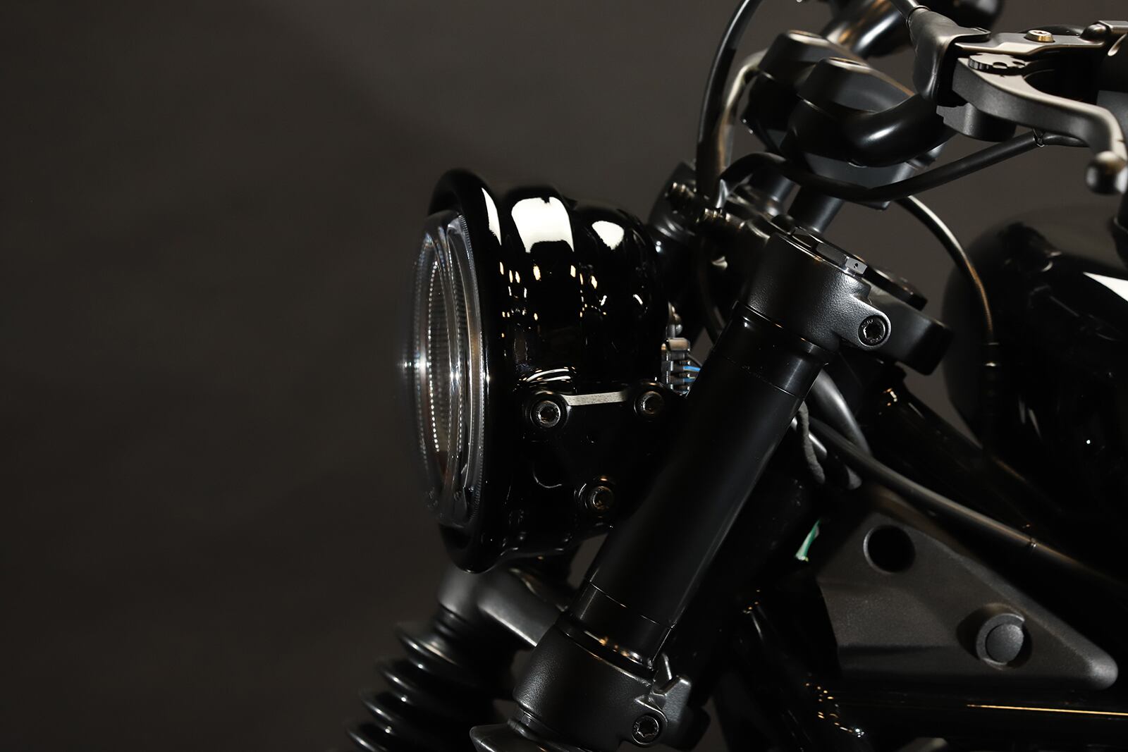 SET of upper fork cover KIT, billet light stay, and side mount headlight case. Since a genuine LED unit is used, the amount of light remains unchanged. Use instead of the unstylish genuine stay when the cowl is removed. A hole in the light stay that can hold an M5 size turn signal. Installation requires removal of the top bridge. Normal blinkers need to be relocated.