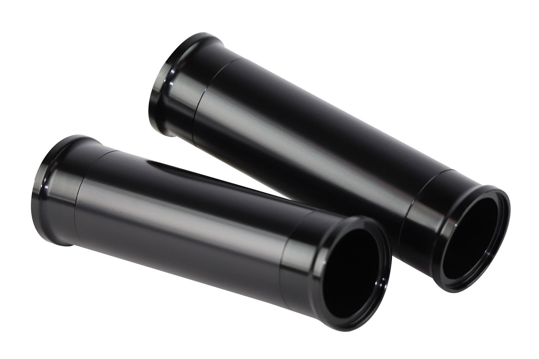 Dress-up parts installed between the top bridge and lower. Three-piece construction with a design on the top and bottom. Pair it with fork boots (sold separately) for an all-black front look. Installation requires removal of the top bridge. Normal blinkers need to be relocated.